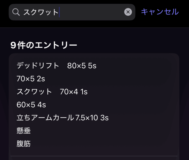 この検索機能の真価は、長期的な成長を確認するときに発揮されます。「スクワット」と検索して時系列で並べてみれば、扱える重量がどのように増えてきたか、フォームがどう改善されてきたかが一目瞭然です。